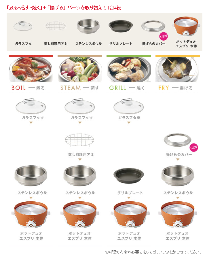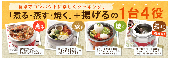一人用鍋の進化系!なんと、「焼く」、「煮る」、「蒸す」機能にプラス「揚げる」機能も追加されました!!
