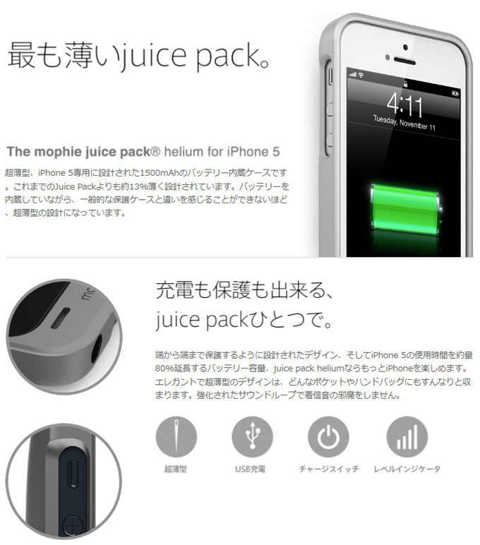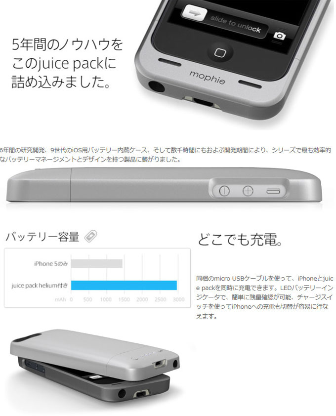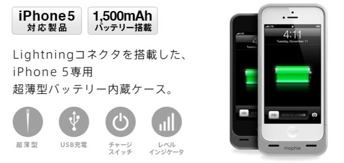 超薄型、iPhone 5専用に設計された1500mAhのバッテリー内蔵ケースです。
