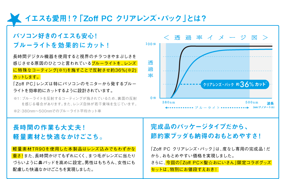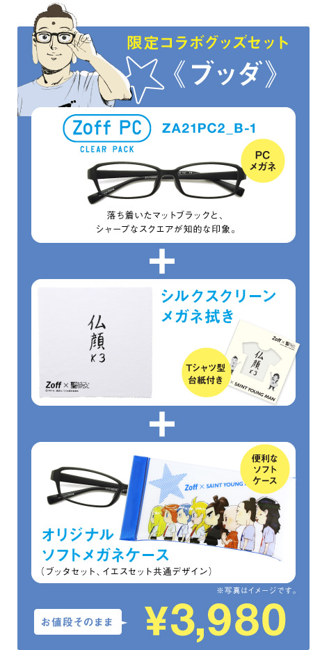 手軽なブルーライト対策として、大好評の「Zoff PC クリアレンズ・パック」に、「Zoff×聖☆おにいさん」オリジナルのメガネ拭き&オリジナルソフトケースをつけた限定コラボグッズセットが降臨!