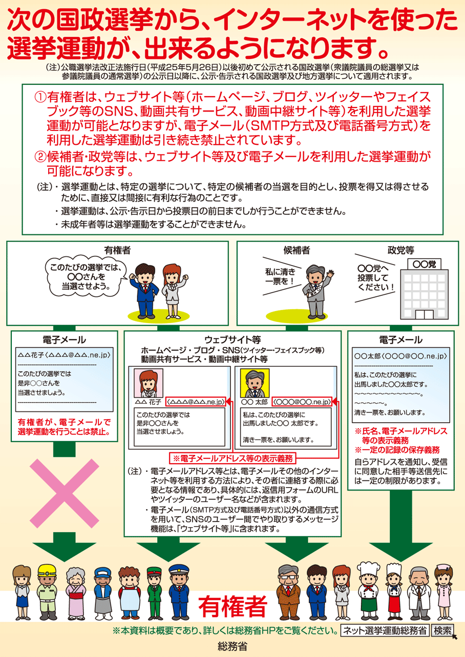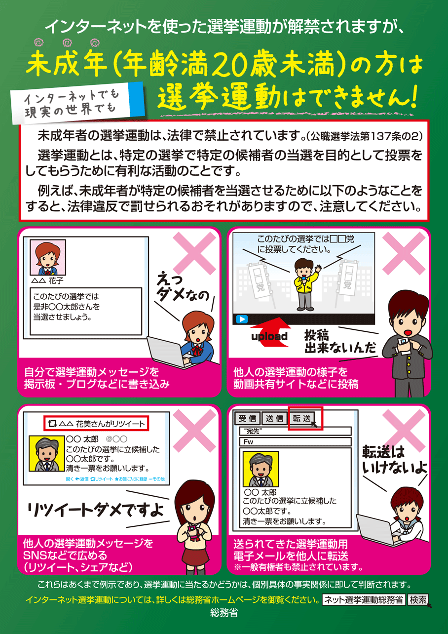 次の参議院議員選挙からインターネットを使った選挙運動が解禁されますが、そのガイドラインです。未成年者向けの物もあります。