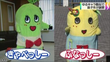 千葉県銚子市がキャベツのPR大使としてお笑いコンビを任命した際、コンビが用意して披露したキャラクターが「ふなっしー」にそっくりだったとして批判のメールなどが相次ぎ、市はホームページでおわびを掲載。