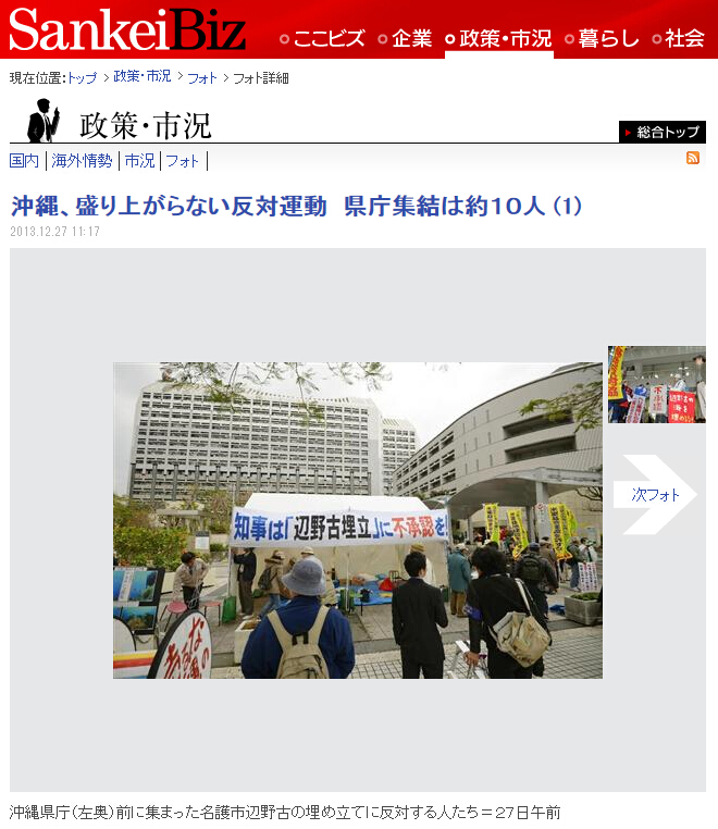 【沖縄】沖縄知事:辺野古埋め立て承認、盛り上がらない反対運動 県庁集結は約10人