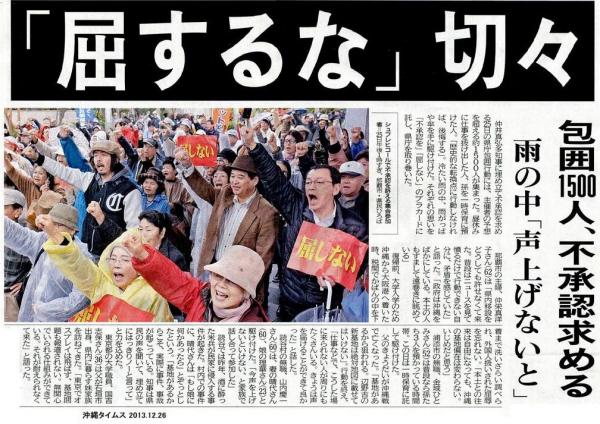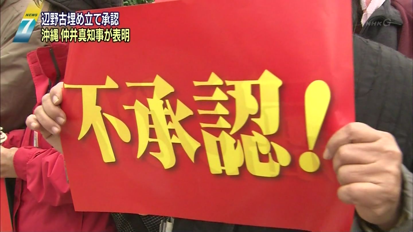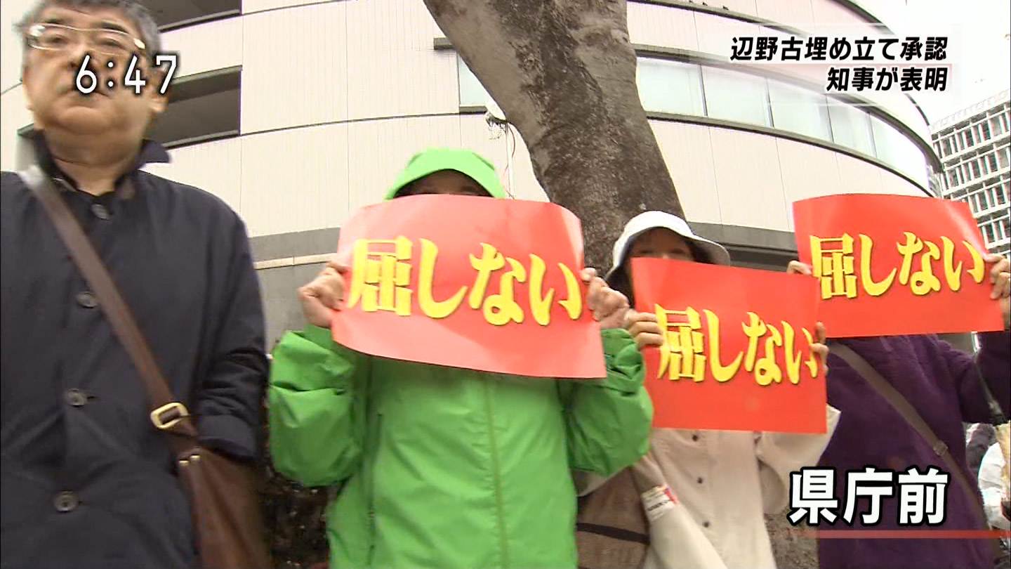 沖縄県の仲井真弘多知事は27日午前、米軍普天間飛行場の移設に向けた同県名護市辺野古の埋め立て申請を承認。反対運動は沖縄県庁前に10人。