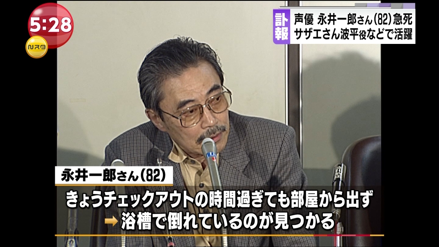 アニメ「サザエさん」で波平さんの声を務めていた声優の永井一郎さんが、27日午前、広島市のホテルで倒れているのが見つかり、病院に運ばれましたが、亡くなりました。82歳でした。