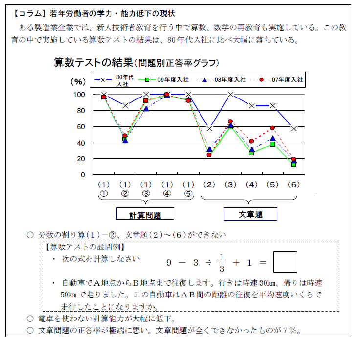 「9 − 3 ÷ 1/3 + 1 = ?」ある大手自動車部品メーカーが、高卒と大卒の技術者の新入社員をテストしたところ、正答率は4割。毎年同様の算数テストを行っており、1980年代の正答率は9割だった。