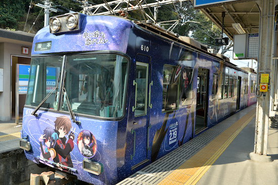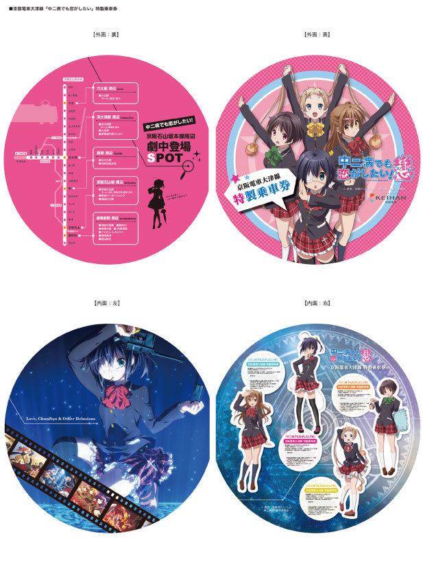 京阪電鉄は、石山坂本線に京阪石山駅前などを舞台とした風景が登場する人気アニメ「中二病でも恋がしたい!」のラッピング電車の運行を始めた。来年3月末まで走る予定。