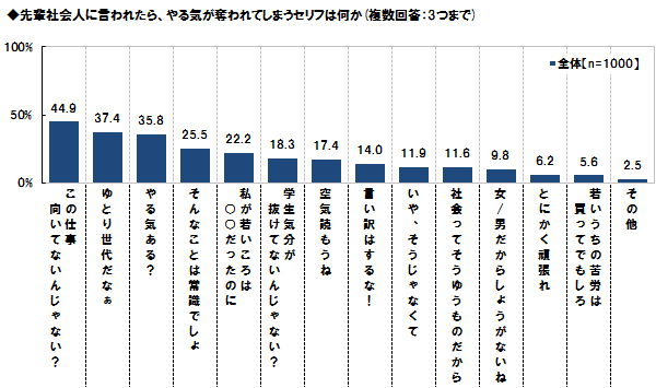 1〜2年目の社会人が「先輩社員に言われてやる気をなくす言葉」のトップは「この仕事、向いてないんじゃない?」だったと。ソニー生命保険調査。