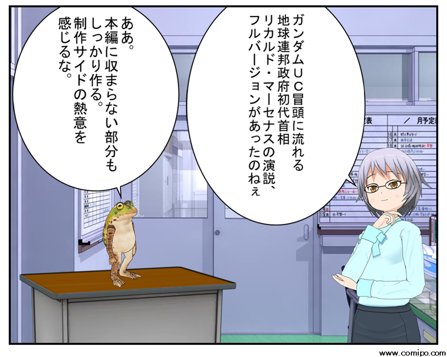 西暦から宇宙世紀への改暦の日、地球連邦政府初代首相 リカルド・マーセナスは首相官邸ラプラスで行われた改暦セレモニーの記念演説のフルバージョンのMAD