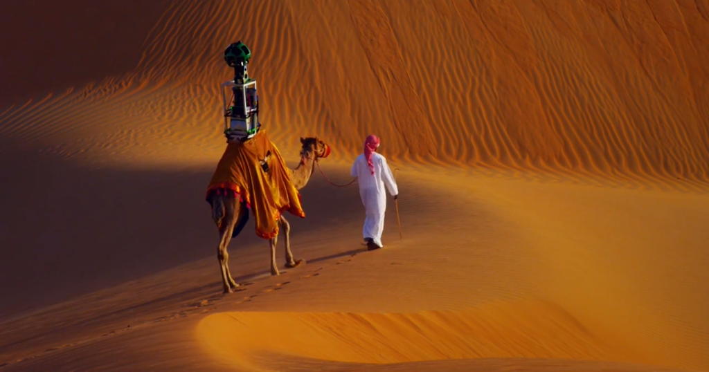 米グーグルがアブダビの砂漠で地図サービス「ストリートビュー」の写真を撮影するため、ラクダを採用した。