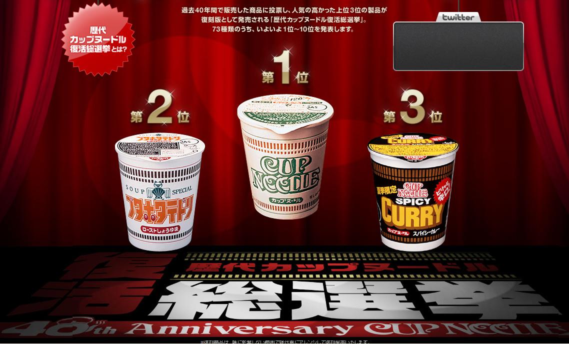 カップヌードル40周年を記念して行われた歴代カップヌードルの復活総選挙。TOP3は復刻版として販売。
