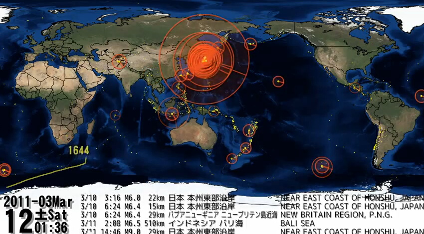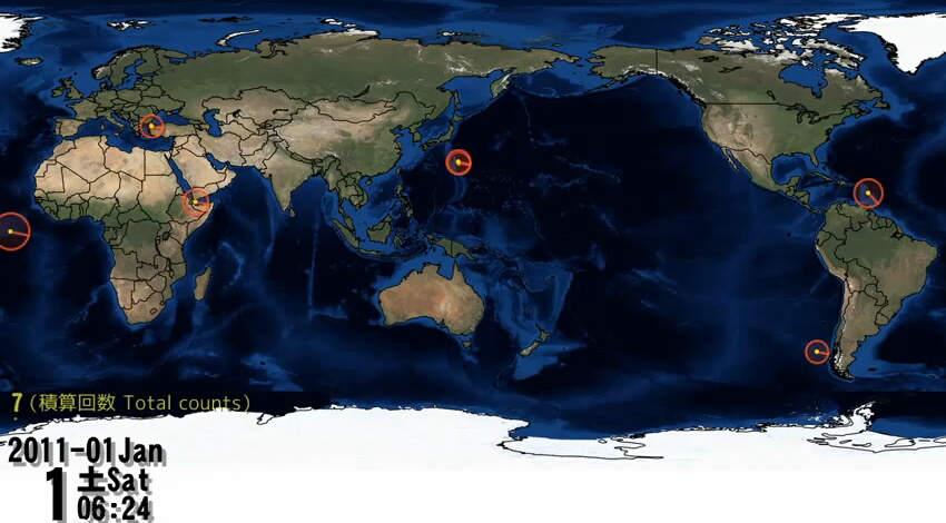 2011年に発生したM4.5以上の地震を時系列順に表示されていく動画です。