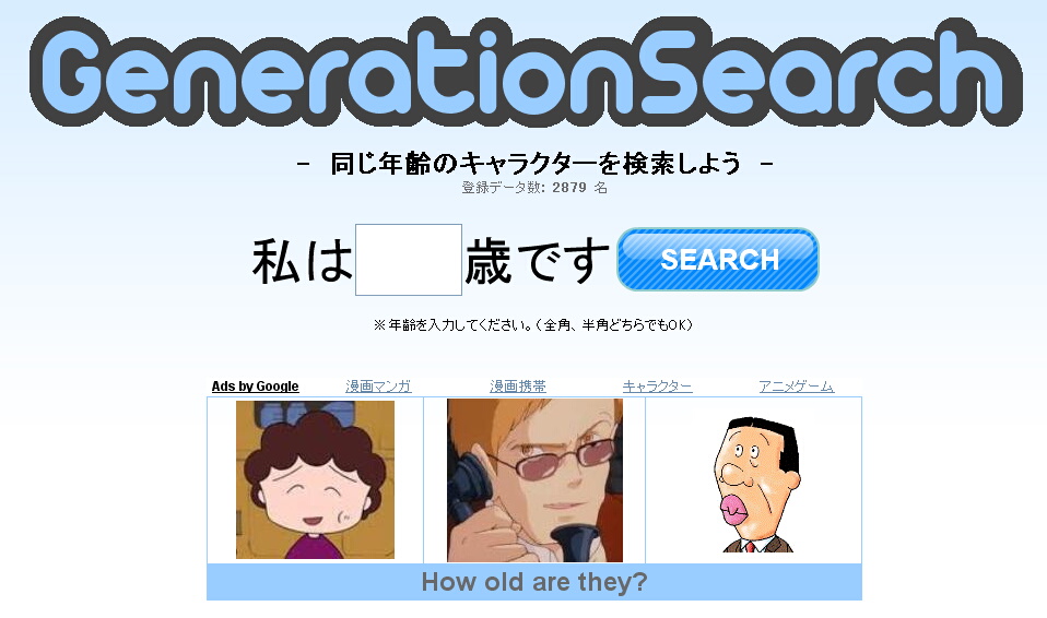 自分と同じ年齢のアニメや漫画、ゲームのキャラを探すことができるサイトです。