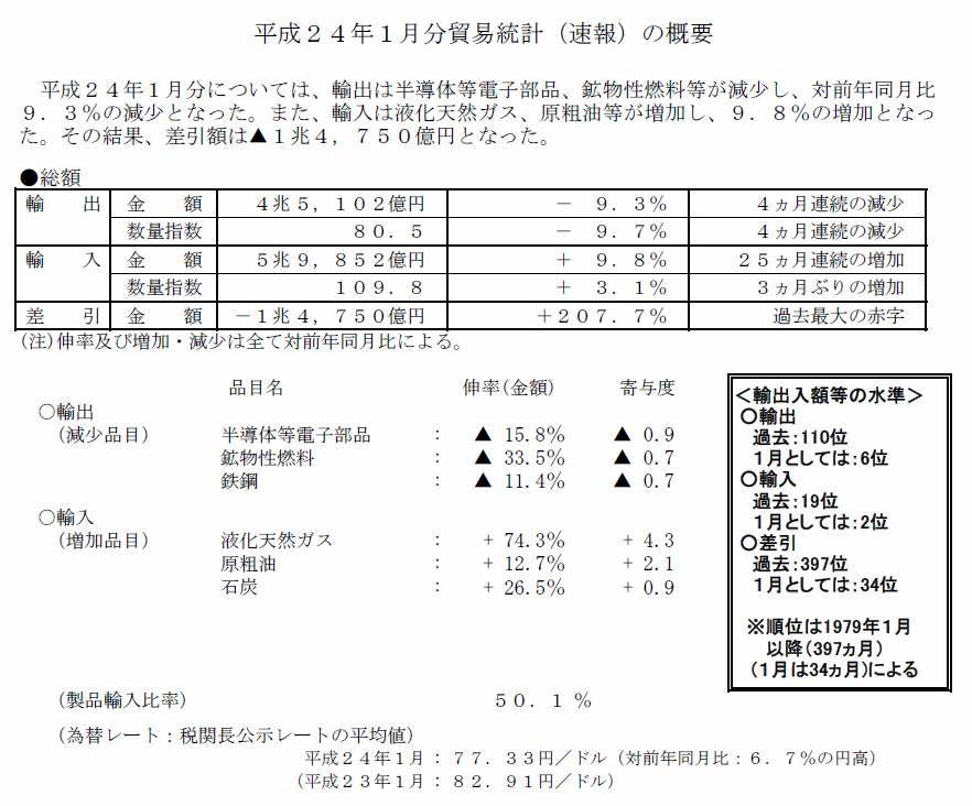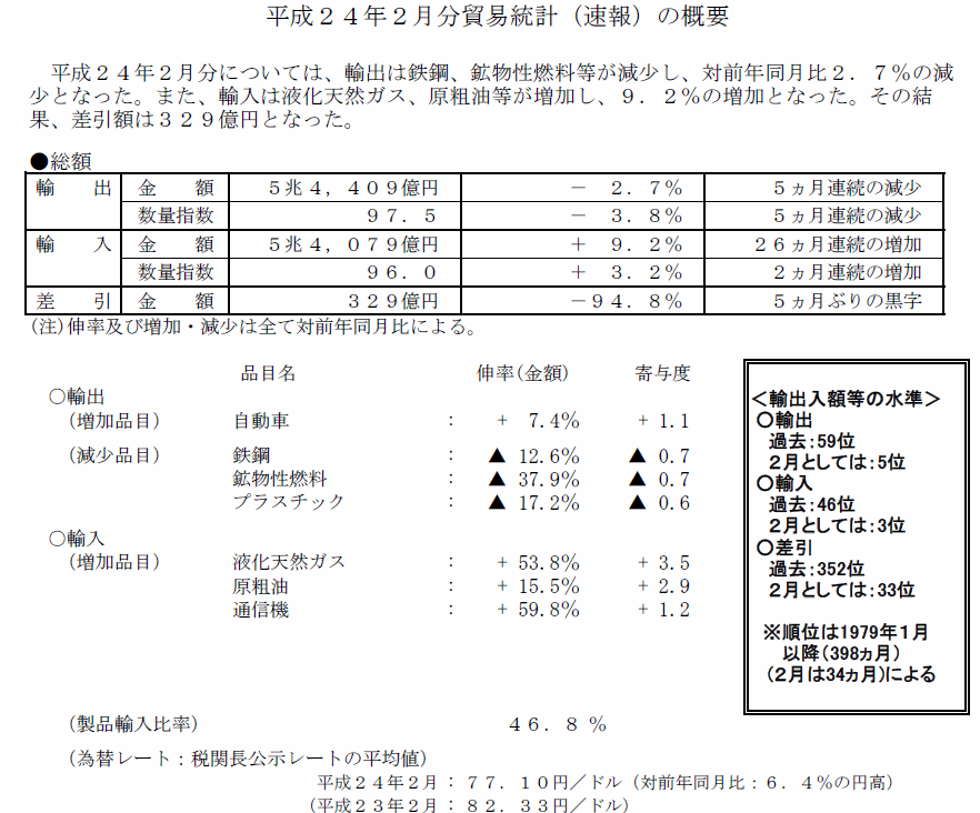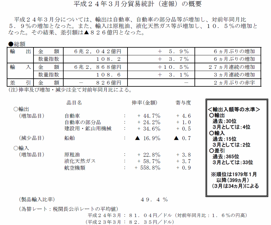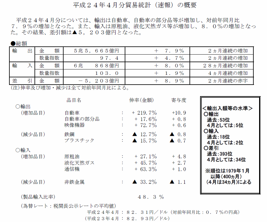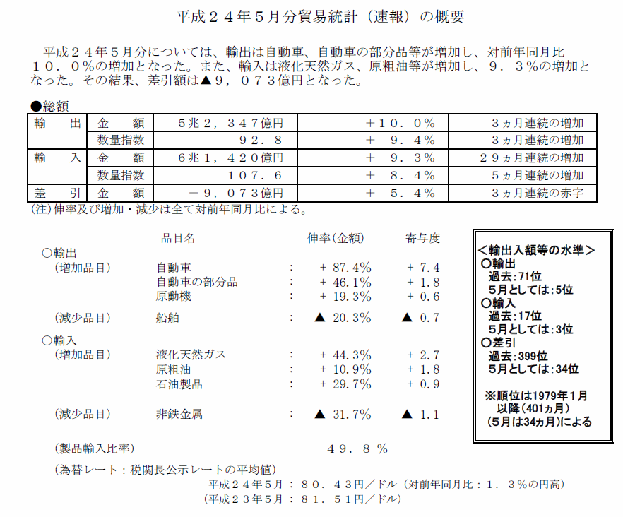 【貿易統計】平成24年度5月分貿易統計(速報)