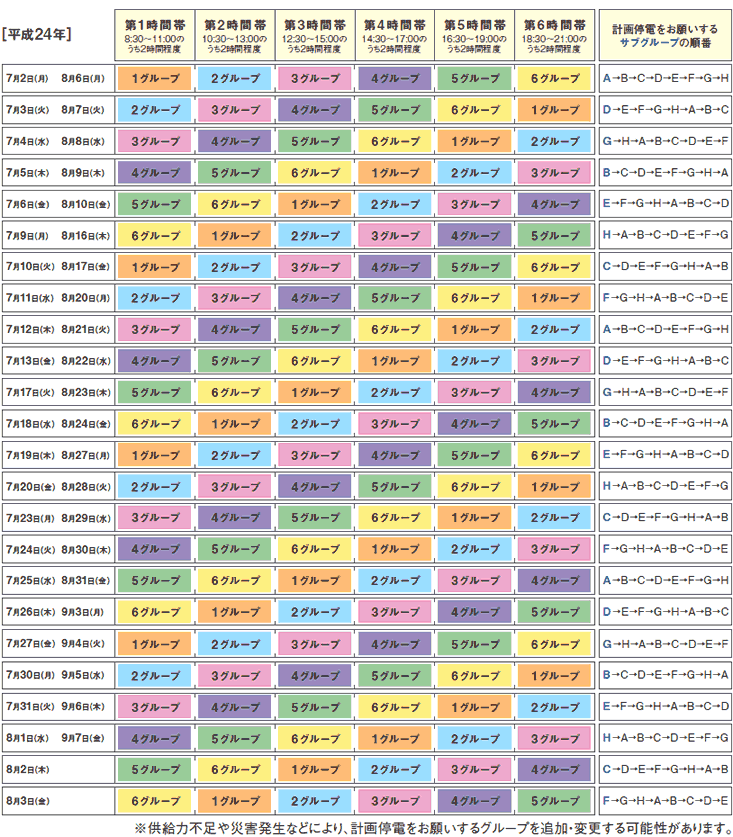 関西電力管轄エリアで2012年7月2日から9月7日まで予定されている計画停電の情報です。