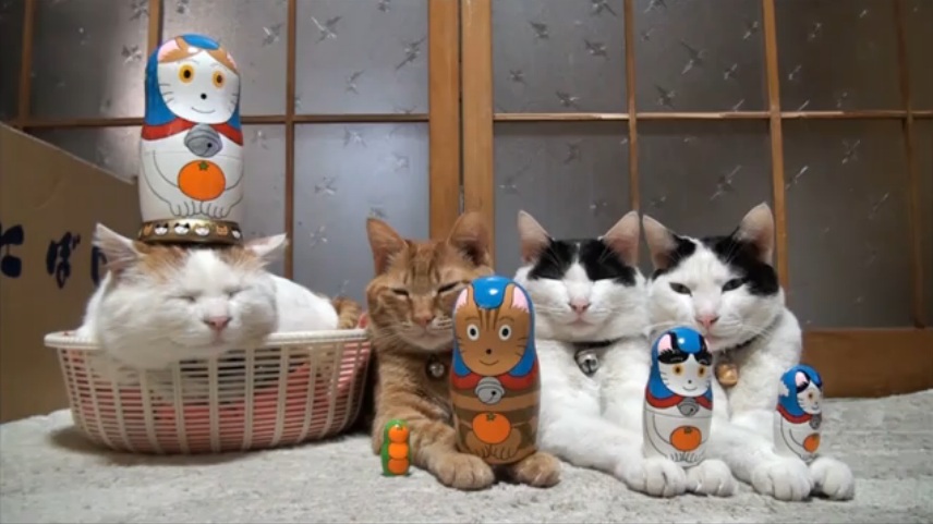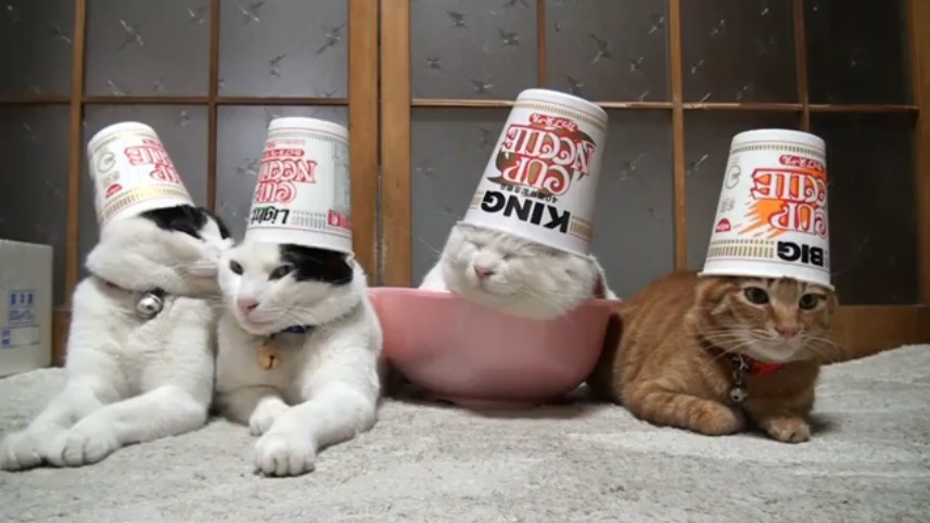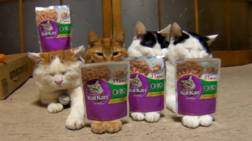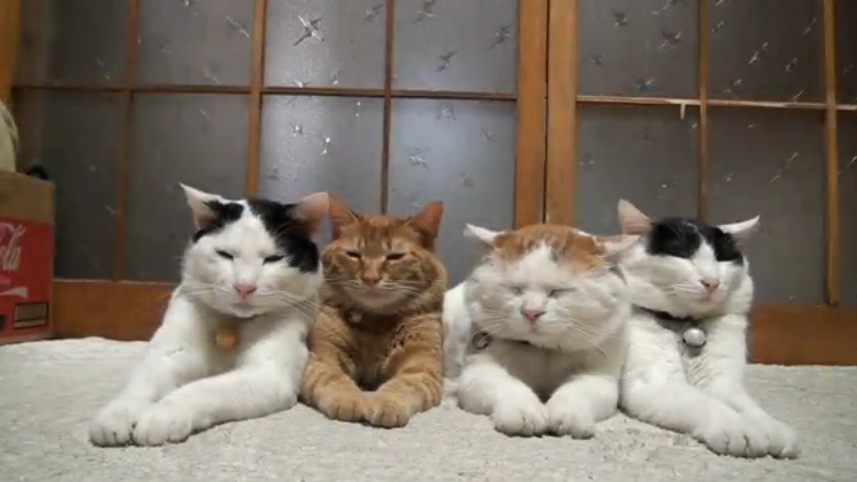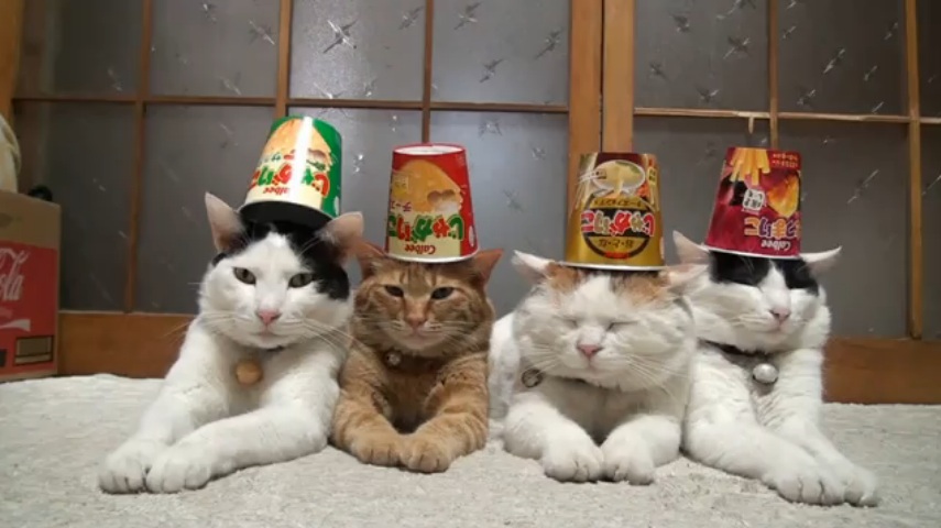 頭や脚に物を乗せられても全く動じない猫四匹組が可愛すぎる
