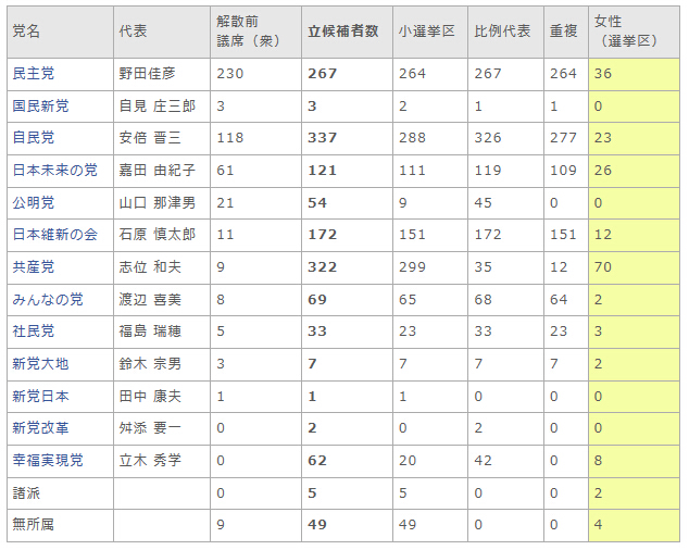第46回 衆議院議員総選挙(投票日:2012年12月16日)